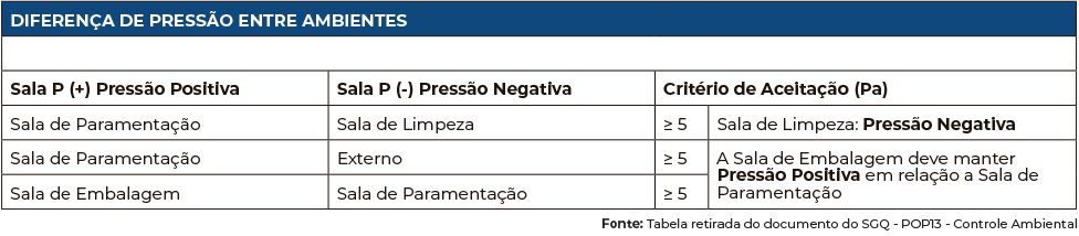A Sala de Limpeza (ISO8) apresenta pressão negativa, de forma a garantir que o ar de dentro dela seja constantemente retirado e não escape para o ambiente circundante, enquanto a Sala de Embalagem (ISO7) e a Sala de Paramentação (ISO8) apresentam pressão positiva onde o ar é constantemente insuflado para o ambiente interno e impede a entrada de ar não filtrado e elementos contaminantes de ambientes externos. A diferença de pressão entre as salas garante o fluxo de ar no interior da sala limpa.