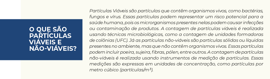 O monitoramento de partículas viáveis compreende a contagem de partículas em superfície e contagem de partículas no ar ambiente, enquanto o monitoramento de partículas não-viáveis compreende avaliação dos seguintes parâmetros: vazão do sistema e número de trocas de ar por hora, diferencial de pressão, estanqueidade do sistema de filtros, contagem de partículas, temperatura e umidade, iluminação e ruído.